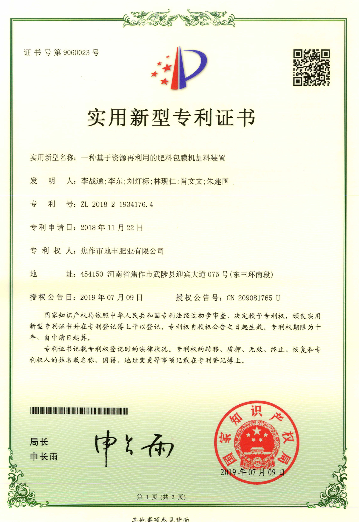 腐殖酸發(fā)明專利證書