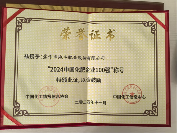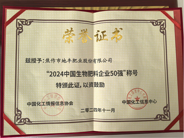 2024年11月29日,一條喜訊從鄭州傳來,在中國化肥企業(yè)100強(qiáng)評選活動暨中國化肥產(chǎn)業(yè)新質(zhì)生產(chǎn)力論壇上,焦作市地豐肥業(yè)股份有限公司再次榮獲“中國化肥企業(yè) 100 強(qiáng)”和“中國生物肥料50強(qiáng)”榮譽(yù)稱號。